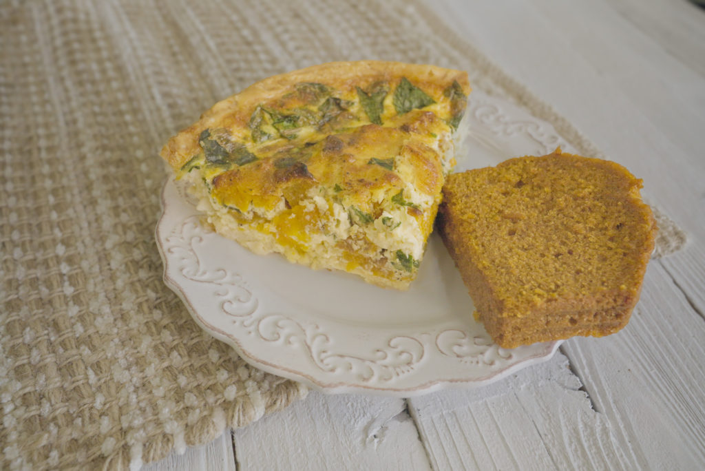 Our signature Fall quiche starts with our f laky crust and is filled with roasted butternut squash, spinach, swiss cheese, parmesan and red onion and served with pumpkin bread.